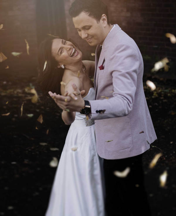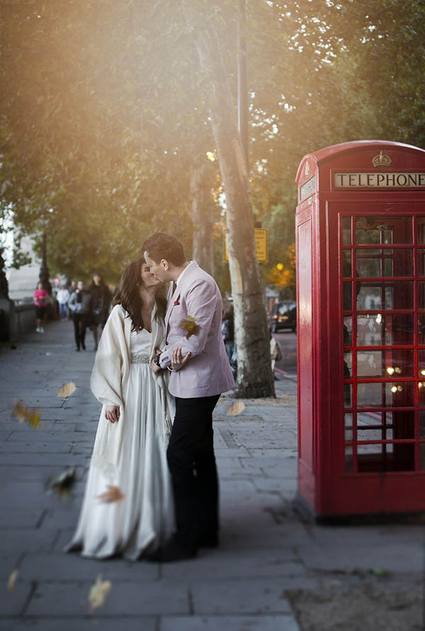 Lo shooting è stato realizzato in settembre a Londra, volevamo ottenere delle immagini moderne e creative, mantenendo sempre il tocco di spontaneità che ci contraddistingue. Il primo set, a causa della pioggia improvvisa, è stato realizzato all’interno di un piccolo bar all’americana dove la coppia ha potuto scherzare e flirtare davanti ad un milkshake! Appena tornato il sole abbiamo scattato qualche romantica foto all’aria aperta, approfittando delle foglie autunnali. Abbiamo poi trovato una lavanderia a gettoni dove fotografare Georgiana e Alex, immortalandoli in qualche immagine diversa dal solito. Le nostre immagini preferite sono state invece scattate in un vicolo con sfondo in lamiera gialla, il posto perfetto per qualche scatto divertente e spontaneo. Ci siamo poi dirette verso il centro, dove abbiamo potuto approfittare della splendida luce tipica della golden hour, sia sul ponte di Londra che vicino al London Eye. Abbiamo cercato di utilizzare soprattutto gli sfondi che la città ci ha offerto, come le tipiche cabine telefoniche o la metropolitana. Il nostro stile è tendenzialmente reportagistico, ma in questo caso abbiamo voluto sperimentare inserendo anche alcune manipolazioni un po’ surreali, come l’immagine della sposa volante, uno stile non adatto a tutte le coppie, ma comunque divertente per qualche immagine un po’ diversa dal solito!