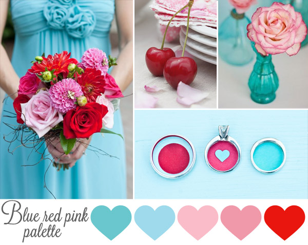 La cosa più difficile per me è stata la scelta dei colori. Sono sempre stata attratta dal rosso in tema di matrimonio, al punto da desiderare per me un abito di questo colore. Non è una tonalità semplice da abbinare, però; credo di aver passato in rassegna tutte le combinazioni prima di approdare a quella che potrebbe essere quella definitiva: tocchi di rosso abbinati all’azzurro e al rosa. Questa palette è ispirata alle fantasie vintage, quelle con le rose rosse e rosa sullo sfondo azzurro (come questa, per esempio). Per rendere meglio l’idea (e anche perché mi diverto troppo con Photoshop) ho realizzato un’inspiration board.