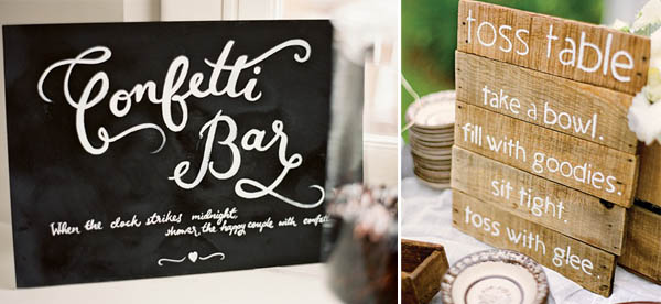 Si tratta di allestire un tavolo con diverse opzioni per il lancio: riso, coriandoli, lavanda, bolle di sapone per i bambini, persino glitter! Saranno gli invitati a scegliere le munizioni che preferiscono per augurarvi fortuna e prosperità. Non dimenticate un segnale con le istruzioni!