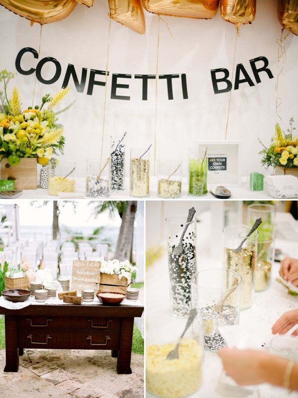 Quello delle alternative al riso è stato uno dei primi argomenti che ho affrontato su questo blog (poi ripreso qui): sono tantissime le possibilità, dalle più classiche come il riso colorato o i petali alle più stravaganti come aeroplanini di carta e piccoli pom poms. Indecisi? Lasciate scegliere agli ospiti allora! Una delle idee più carine che ho scovato di recente è quella del confetti bar, termine inglese (che in italiano fa pensare a tutt’altro!) per indicare una postazione di lancio di coriandoli.