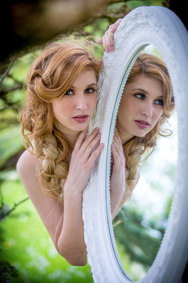 Una mela le cade in testa, la bella si sveglia nelle vesti di Biancaneve. Si guarda nello specchio, accarezzando la sua lunga treccia creata dalla fata Nadine.