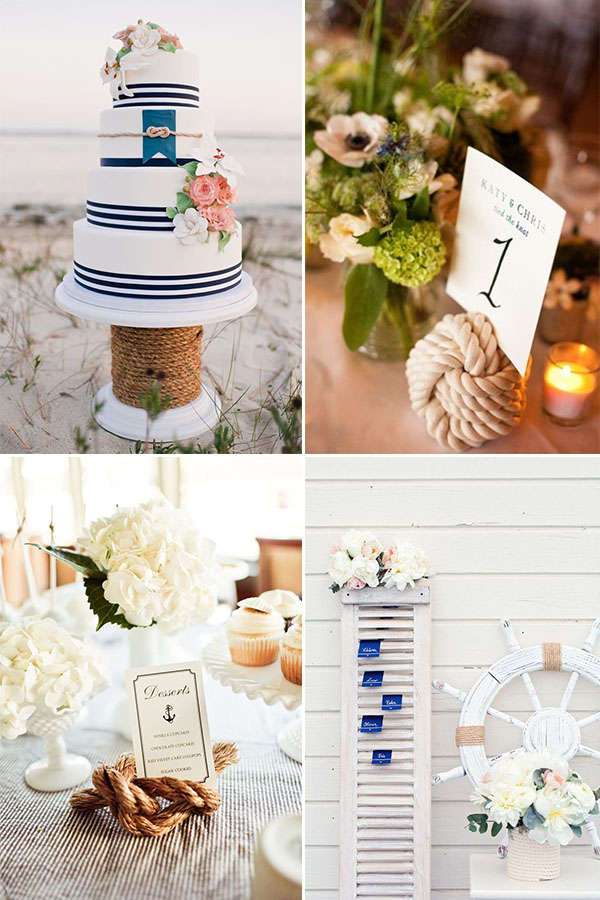 Un altro must have è sicuramente la corda da marinaio, avvolta attorno ai vasi portafiori, o legata a formare dei nodi. A me piace particolarmente la versione segnatavolo, oltre al piccolo nodo sulla torta!