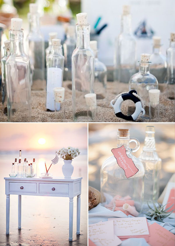 Delle piccole bottiglie di vetro possono diventare escort cards o segnaposto. Io adoro anche la versione guestbook, con i messaggi dei vostri ospiti inseriti in bottiglia. Perfetta anche come capsula del tempo, da aprire in occasione di un anniversario!