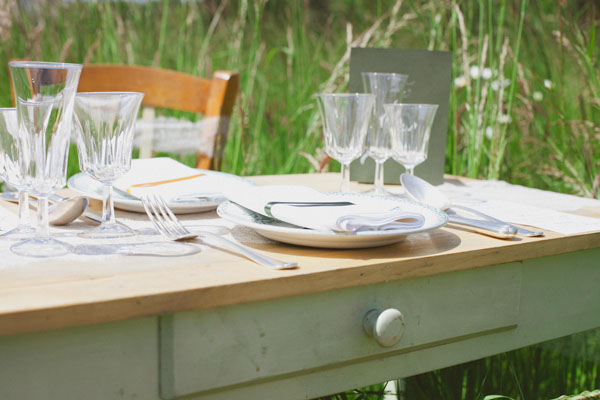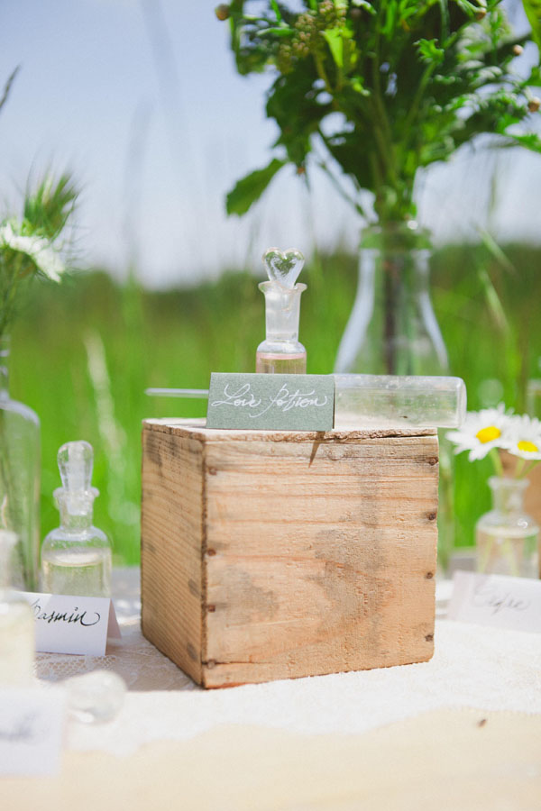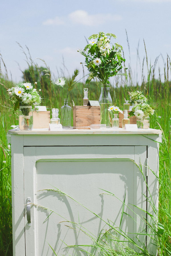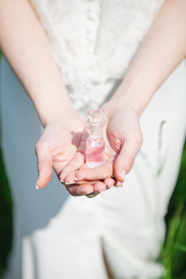 Per questo shooting, ho voluto focalizzarmi su due elementi, una tavola imbandita in maniera un po’ bohème e retrò e un “bar à parfums”: una particolare variante del candy bar. L’idea sarebbe di proporre agli invitati un’animazione divertente sulla creazione di un profumo personalizzato che potrebbero conservare come ricordo della giornata. E perché non cimentarsi a comporre il profumo perfetto degli sposi?