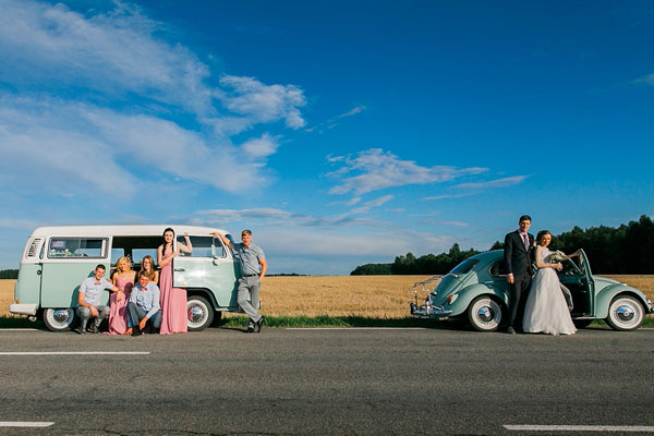 Al momento di lasciare la casa della sposa per recarsi in chiesa ha cominciato a piovere e la pioggia è andata e venuta per tutto il giorno. Le damigelle sono arrivate in chiesa a bordo di uno stiloso furgoncino Volkswagen, mentre la sposa ha scelto un maggiolino Volkswagen.