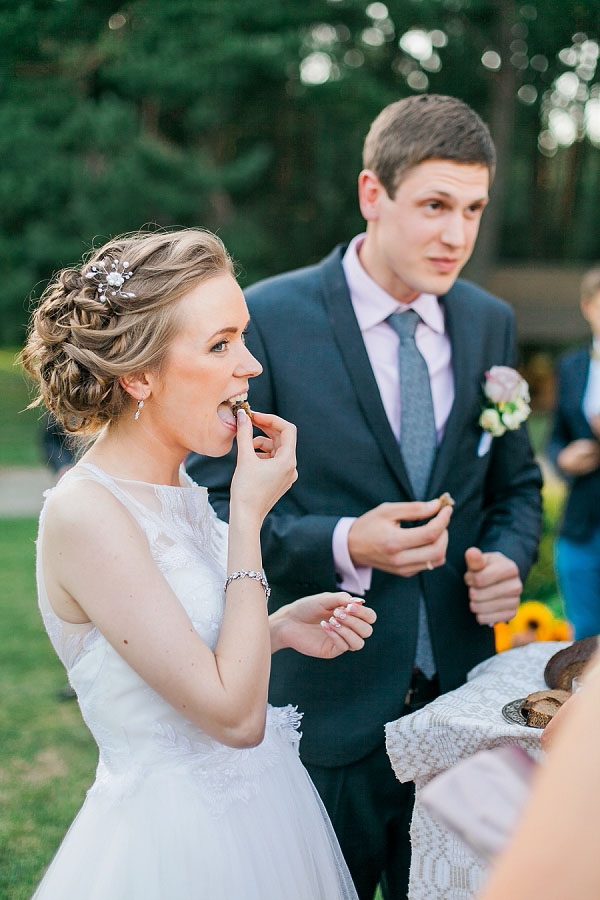 Il ricevimento si è tenuto a Pusyno vila. Lì Ernesta ed Ernoldas sono stati accolti dai loro genitori con pane di segale, sale e acqua. Il pane rappresenta la speranza simbolica che gli sposi non siano mai affamati, il sale ricorda loro che la vita insieme avrà le sue difficoltà e l’acqua rappresenta l’augurio dei genitori per la salute e la felicità della coppia.