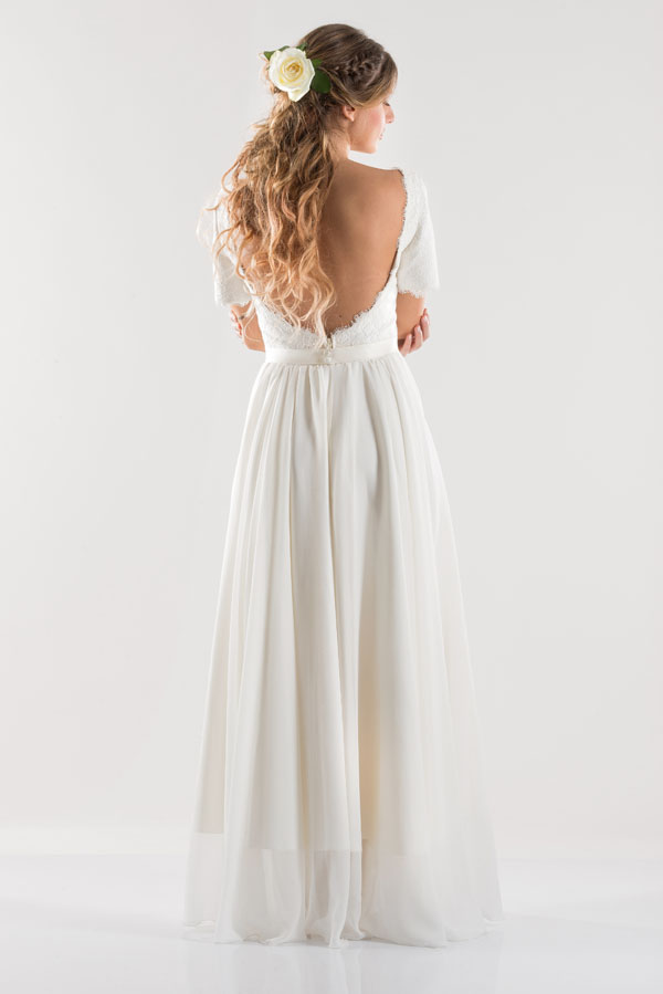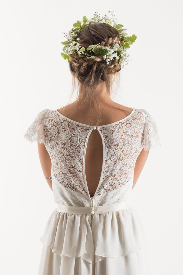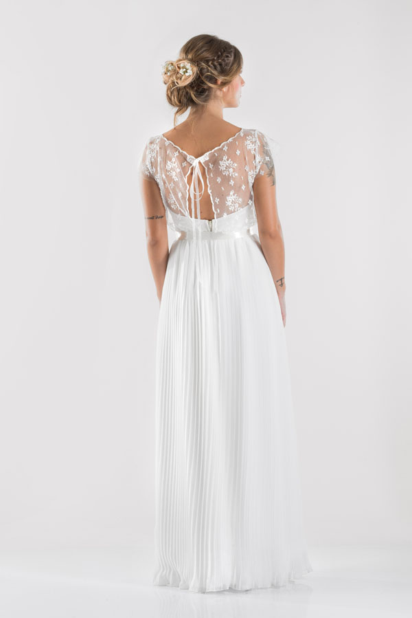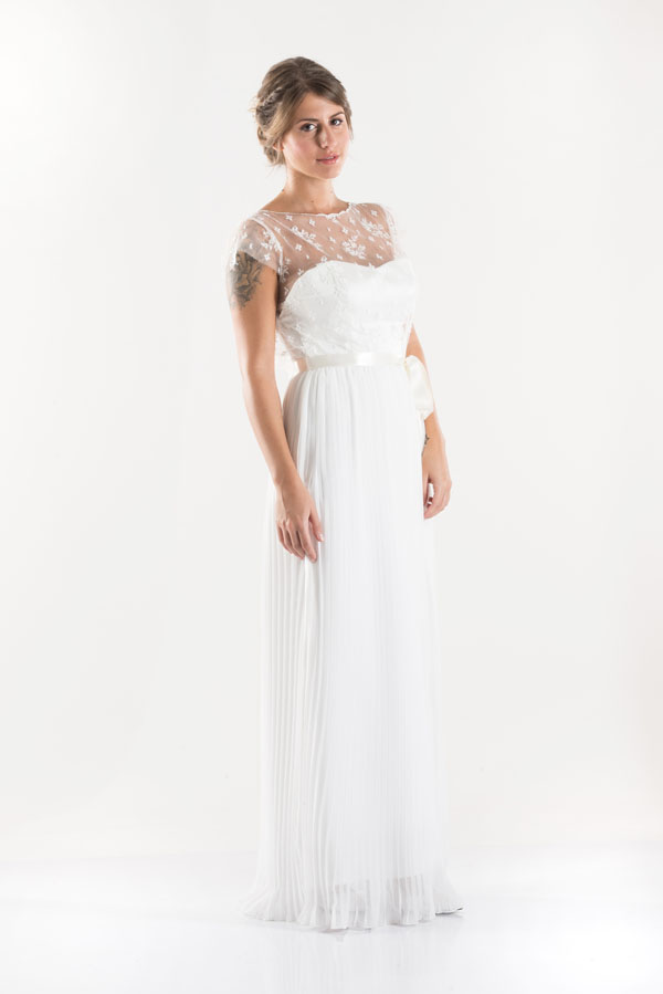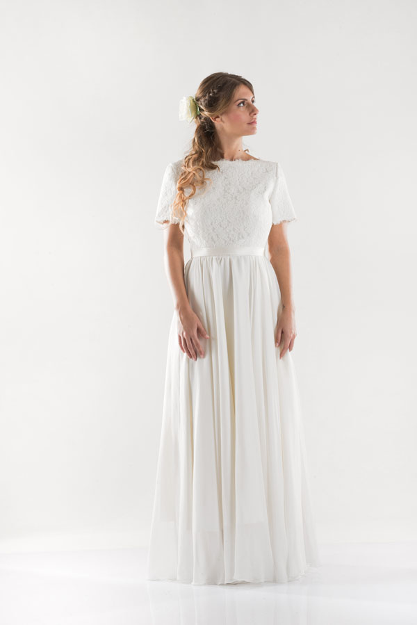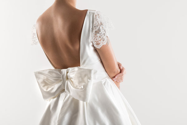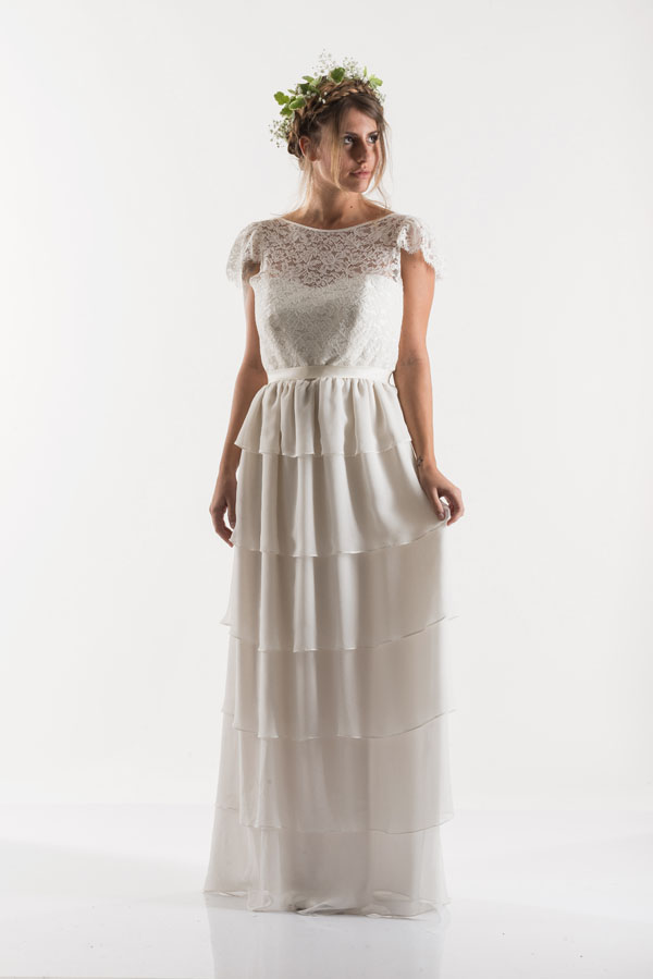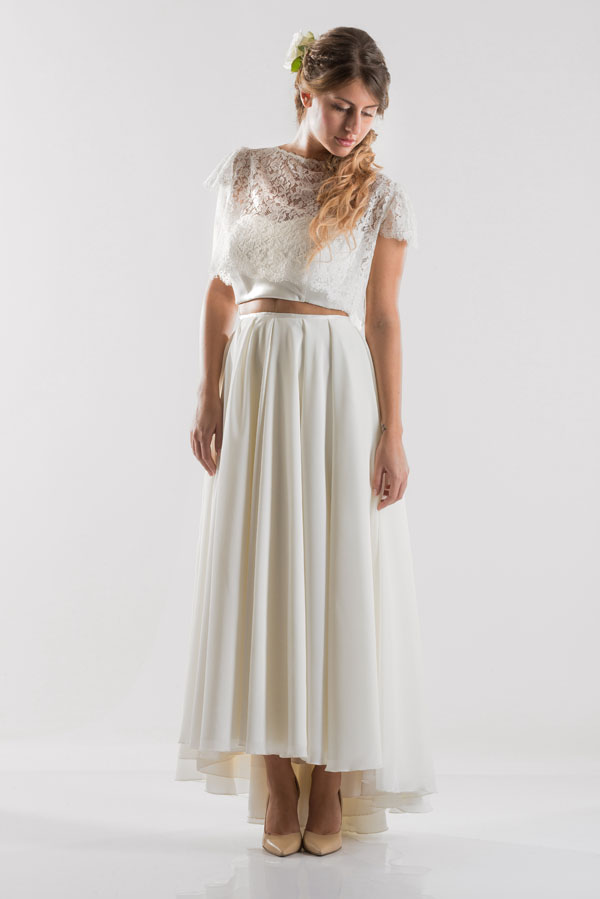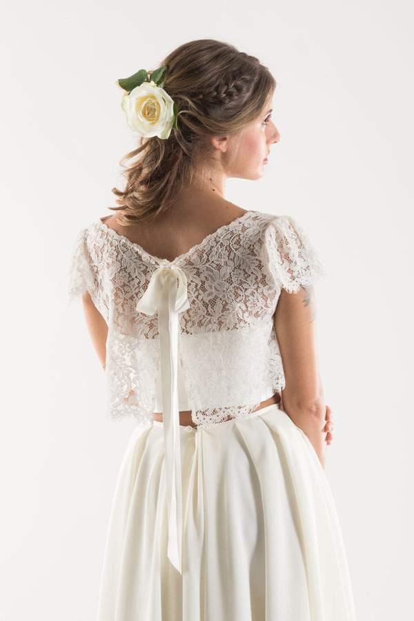 Eleganti pizzi chantilly si uniscono a gonne morbide e fluttuose a balze e plissettate, ed elementi vistosi ed irriverenti come fiocchi oversized e crop top si combinano con romantiche trasparenze di pizzo, per una sposa modaiola che nel giorno del suo matrimonio vuole essere stilosa e moderna.