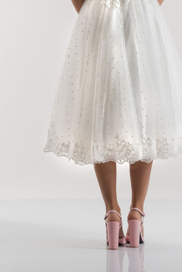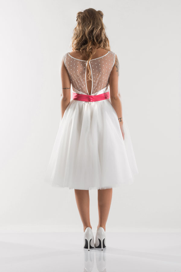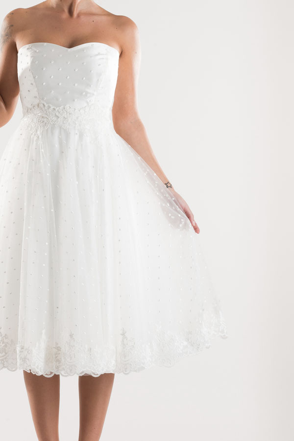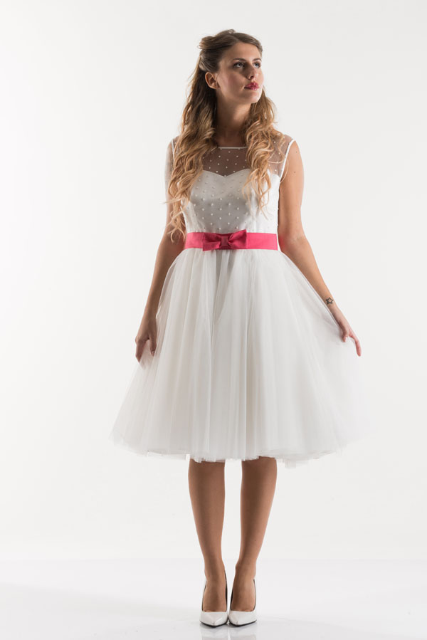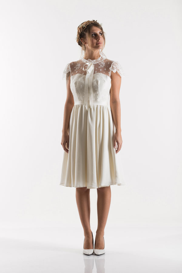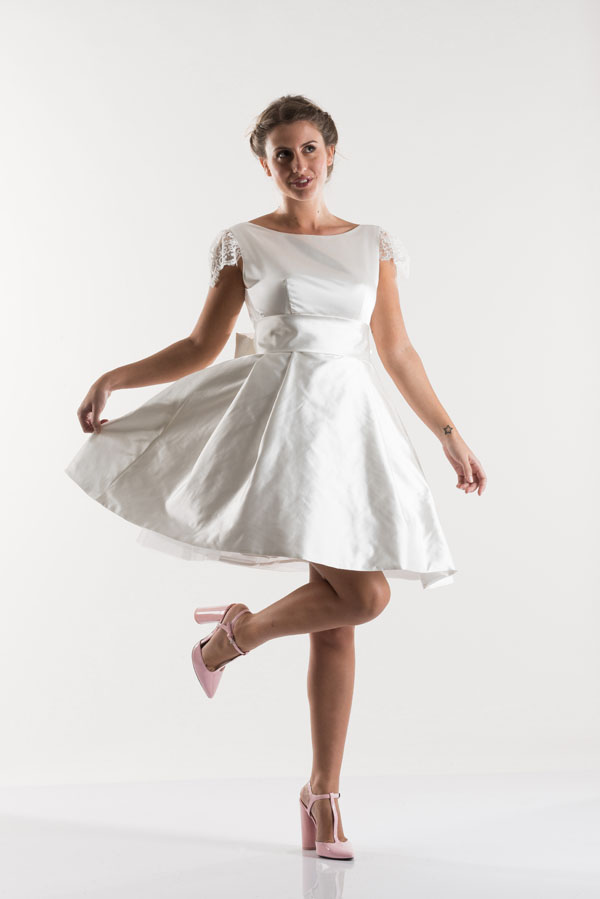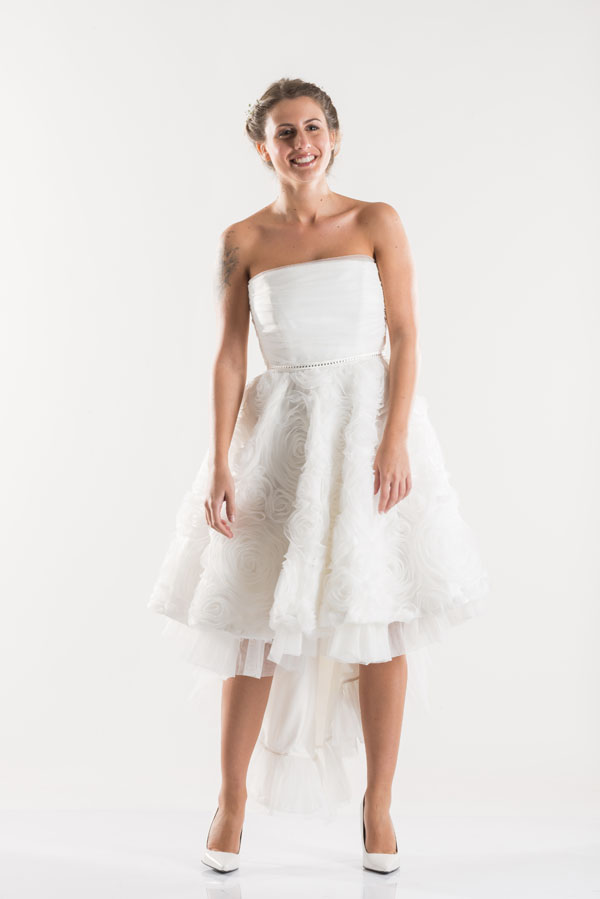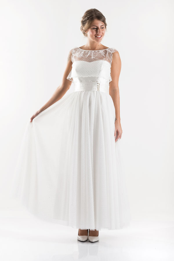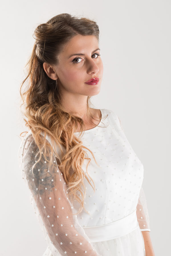 Gli abiti della collezione di Nadia Manzato si rivolgono a una sposa giovane e giocosa, che vuole discostarsi dai canoni tradizionali senza rinunciare a femminilità ed eleganza: tagli bon-ton con scolli a barchetta e maniche lunghe si mischiano a tessuti divertenti come tulli ricamati a pois, plumetis e shantung di seta colorati nelle cinture.
