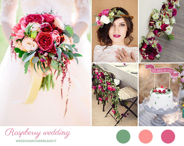 La palette di oggi infatti è basata sul color lampone, una bella tonalità di rosa che non uso spesso ma mi piace moltissimo, soprattutto in abbinamento al verde. Questi colori sono adatti a tutte le stagioni ma con tutti i fiori presenti in questa board la prima cosa che mi viene in mente e un bel matrimonio primaverile all’aperto!
