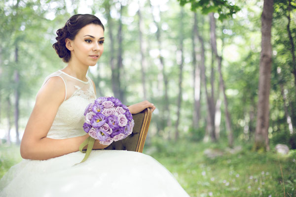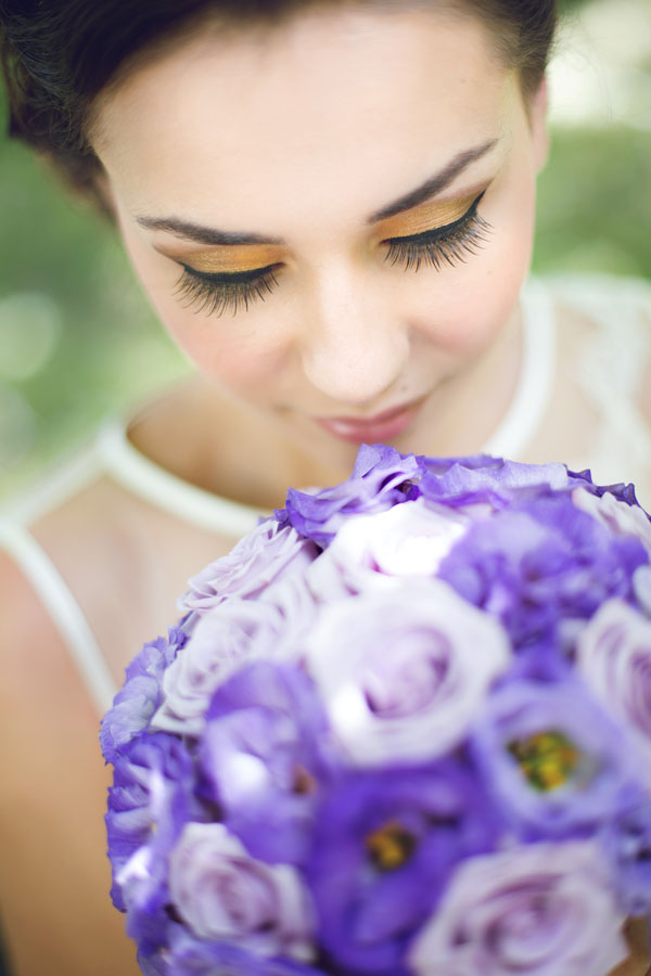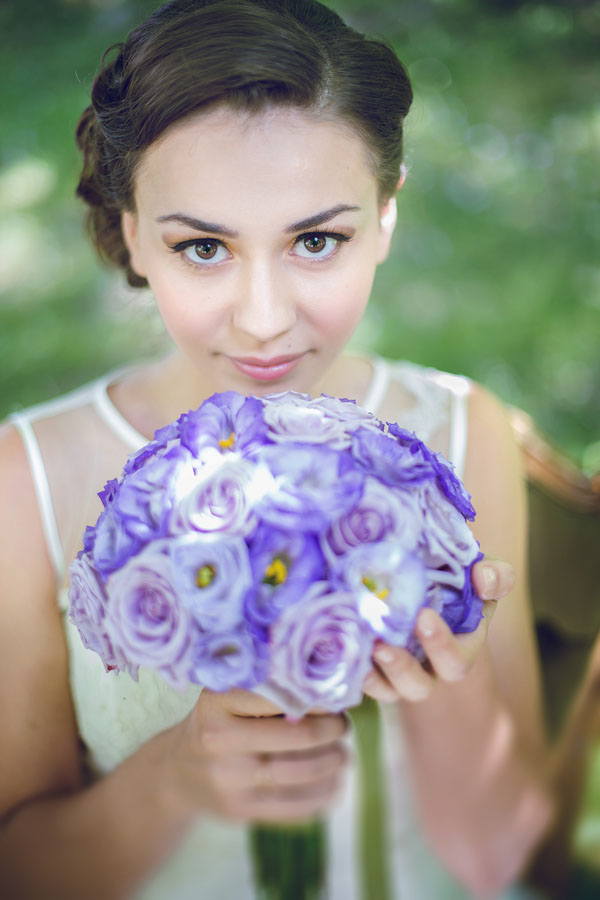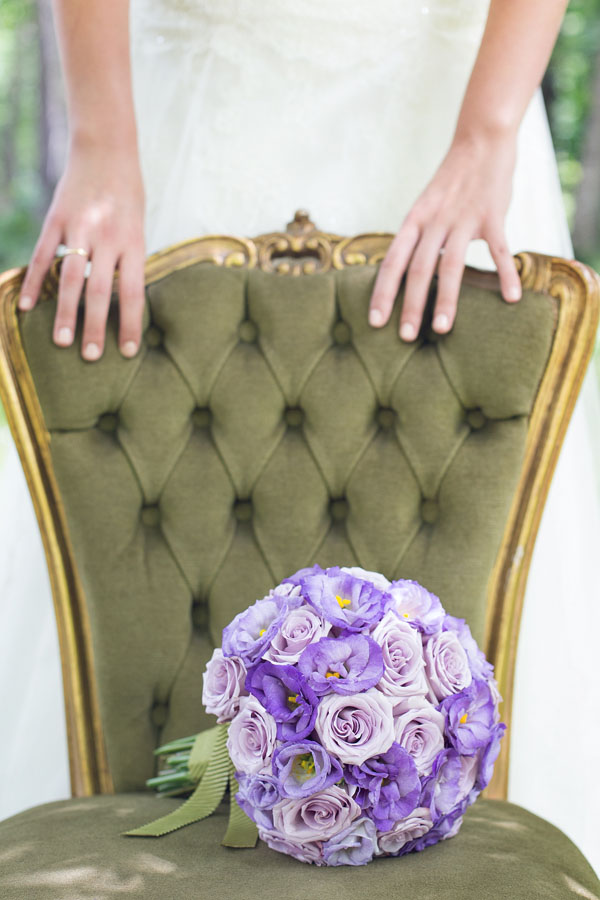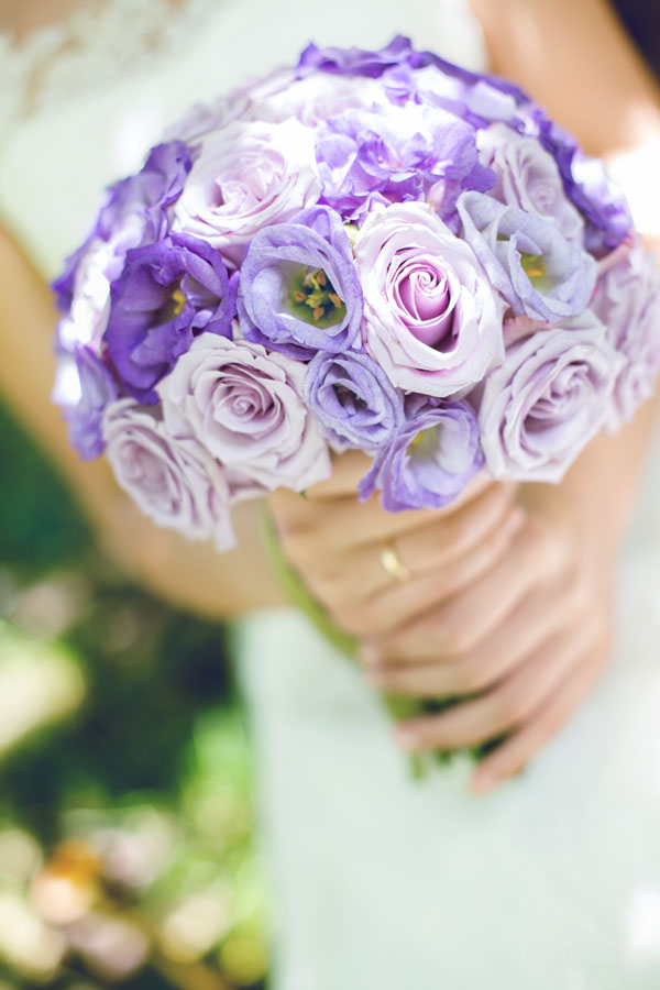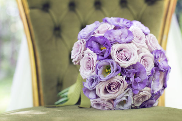 La scelta dei colori è stata particolare. Mi è piaciuto mischiare le tonalità di viola con il verde e l’oro. Ho trovato un abbinamento molto speciale tra di loro. Il bouquet è stato realizzato da me con rose lilla e lisianthus di tonalità viola, avvolto poi con un nastro di raso ondulato di colore verde.