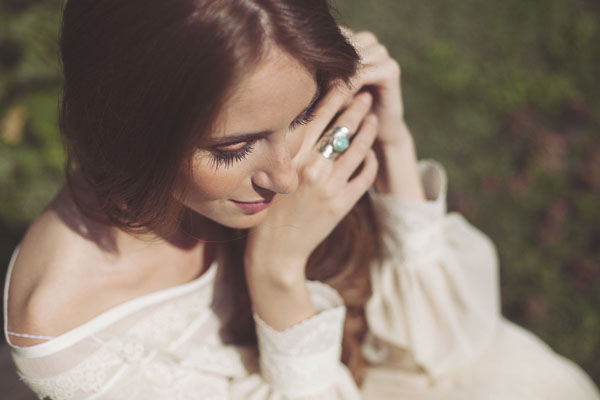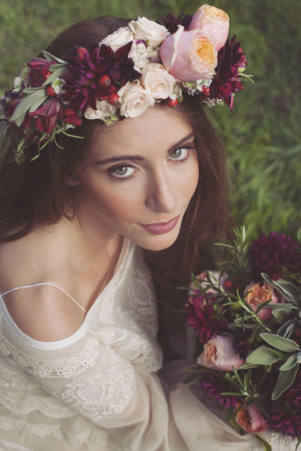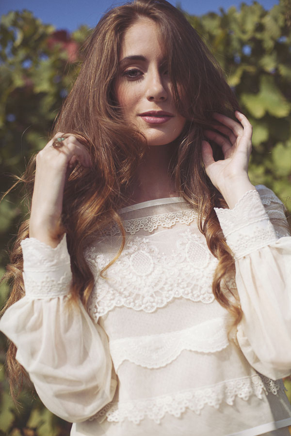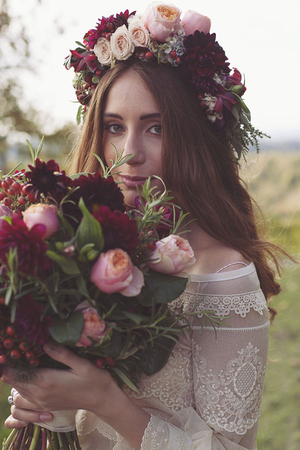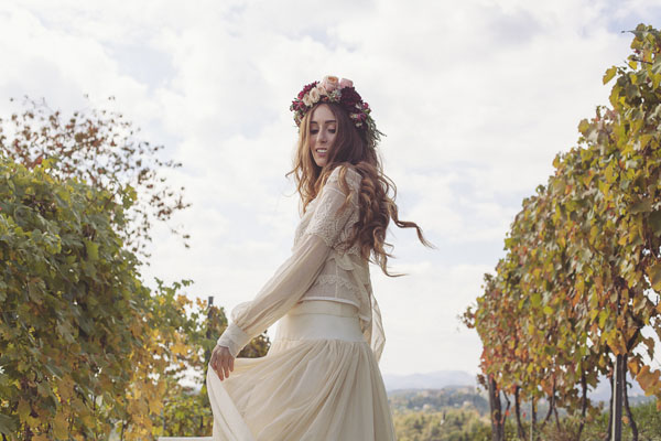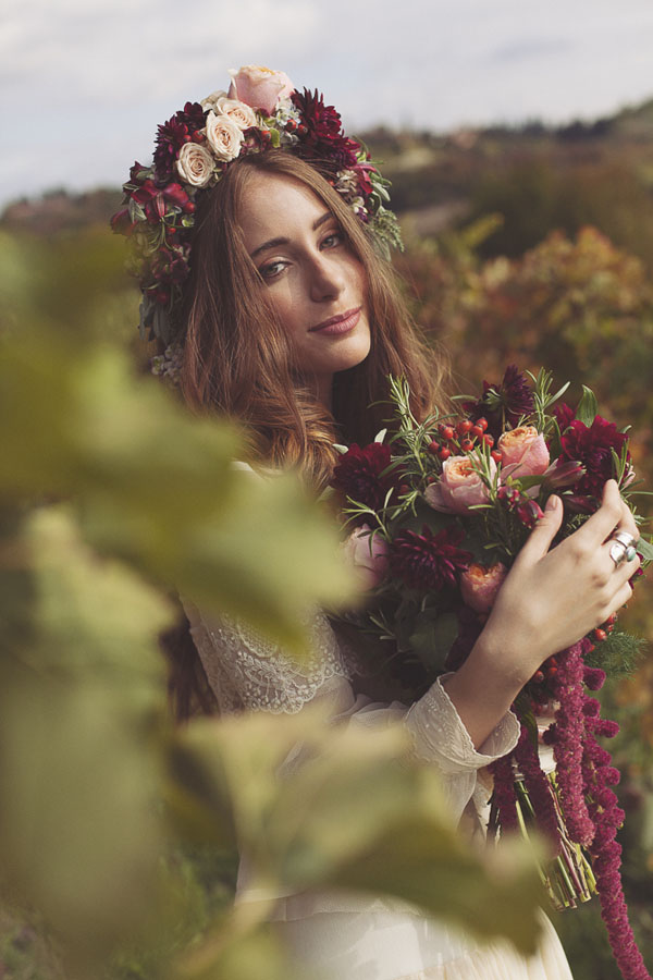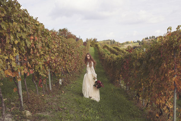 I vigneti sono stati usati per valorizzare una sposa dallo stile bohémien, con lineamenti delicati e soavi e lunghi capelli rossi.