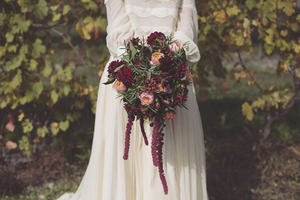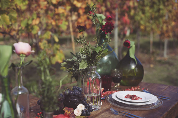Questo inspiration shoot ha i colori di una tiepida giornata di autunno: Marsala, il colore dell’anno, è favoloso in abbinamento al rosa e al rosso. Roberta Cavaliere e Tiziana Gallo hanno ricreato un matrimonio deliziosamente bohémien tra i vigneti del Monferrato: rose, dalie, amaranto e bacche, ma anche melograni, uva ed erbe aromatiche, tra bottiglie di vetro e foglie autunnali.