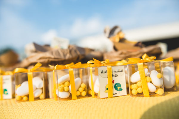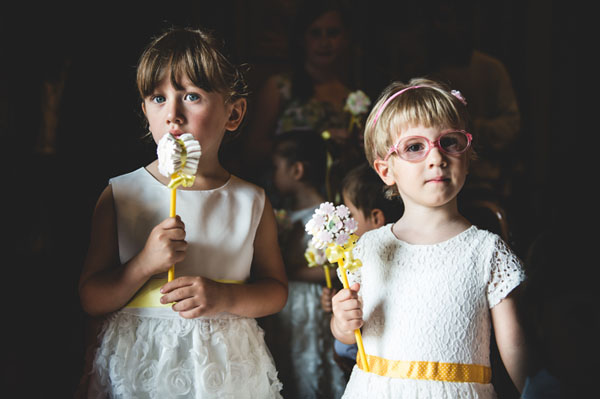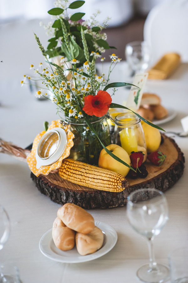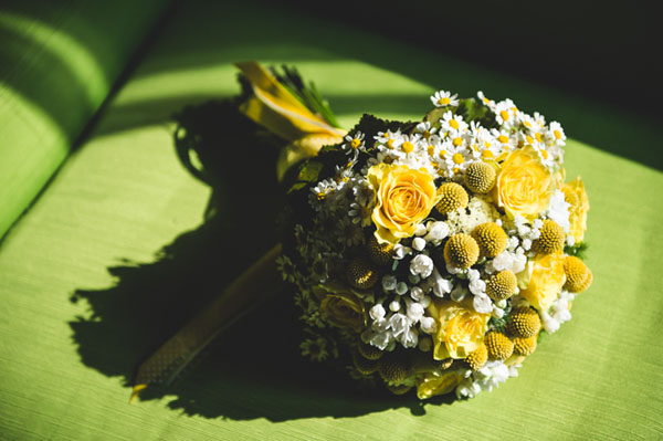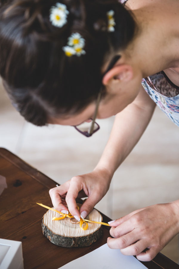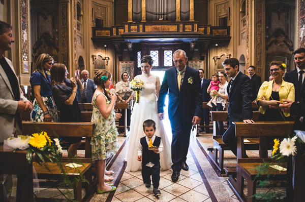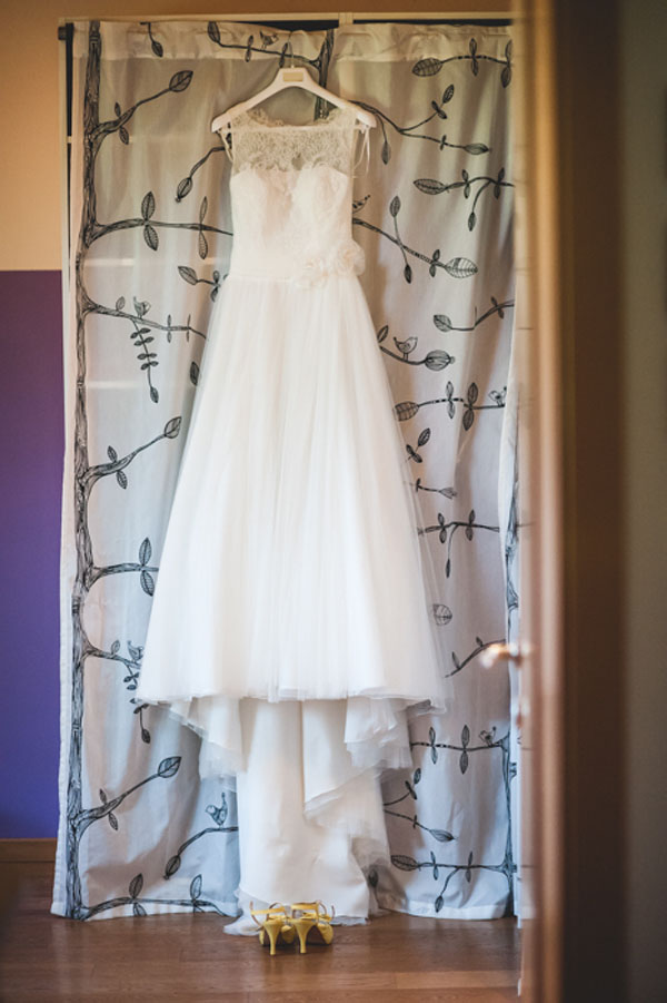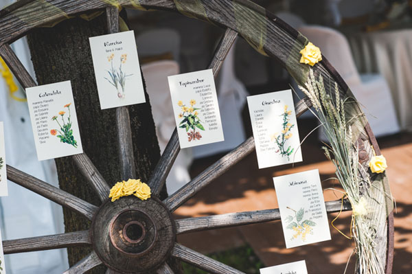 È stato un matrimonio decisamente informale, ambientato nella cascina dove abitavo quindi improntato su uno stile country. Il colore che abbiamo scelto è stato il giallo perché da sempre è il mio colore preferito, trasmette gioia e allegria e non avrei potuto farne a meno il giorno del matrimonio. Il filo conduttore era proprio il giallo che abbiamo utilizzato ovunque (temevo che il risultato finale fosse troppo giallo ma in realtà era tutto perfetto), dalle partecipazioni alle decorazioni per la location, nel bouquet e nei fiori per la cerimonia; anche le mie scarpe erano gialle e abbiamo invitato i nostri ospiti a indossare un particolare giallo…qualcuno ha accolto la proposta piacevolmente!