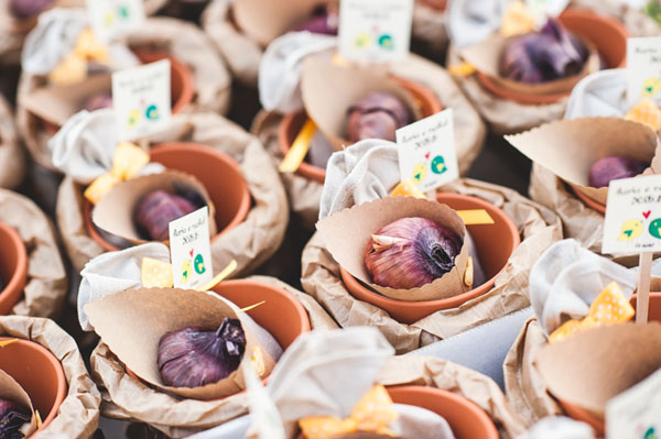 Io, mia mamma e ovviamente grazie anche all’aiuto di alcune persone che ci hanno dato una mano abbiamo creato tutte le decorazioni per il ricevimento: bandierine, palle di carta velina, palle di roselline di carta crespa, le bomboniere cioè dei vasetti in terracotta con dentro un bulbo (persino i sacchettini dei confetti li ha cuciti mamma Luci), i centrotavola con fiori raccolti nei campi la mattina stessa e bottiglie e vasetti riciclati, il gratta e vinci per gli ospiti.