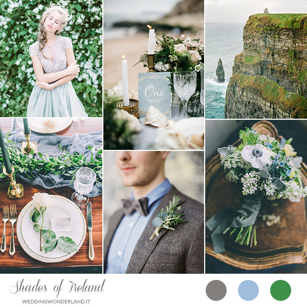 Dato che domani è il giorno di San Patrizio, questa inspiration board è liberamente ispirata ai colori dell’Irlanda: tanto verde (non per caso è chiamata l’isola di Smeraldo), l’azzurro cupo del mare e il grigio delle sue scogliere. Niente quadrifogli o folletti, ma un’ispirazione very chic per un matrimonio dallo stile organico, tra rigoglioso foliage, materiali naturali e giusto un tocco di oro per rendere il tutto più prezioso.