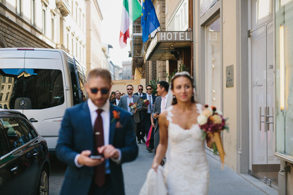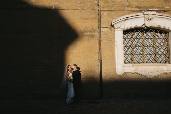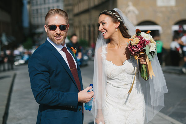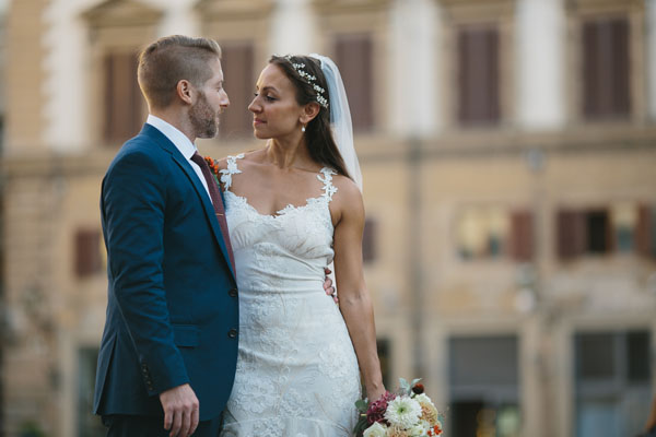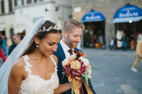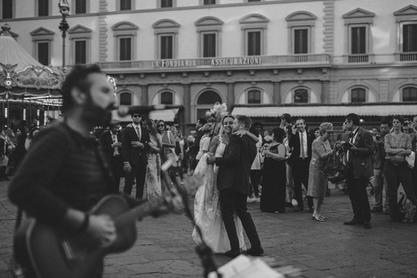 Li abbiamo incontrati la mattina del loro matrimonio, felici, rilassati e un po’ emozionati. Li abbiamo fotografati quando si sono visti per la prima volta in abito da sposi, prima di camminare tutti insieme per andare a sposarsi. Li abbiamo seguiti, guidati, ci siamo divertiti con loro mentre camminavamo un po’ a zonzo e un po’ no per scoprire e immortalare la bellezza di Firenze e la loro. E poi, un primo ballo improvvisato, in mezzo ad una piazza gremita, di sabato pomeriggio, sulle note di un cantante di strada prima stupito poi compiaciuto.