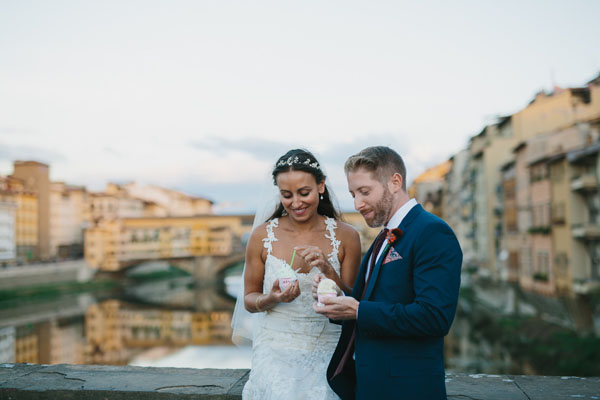 Ma camminare stanca. Aggiungeteci tutte le emozioni della giornata e i tacchi alti e capirete perché un gelato alle sei di sera fosse del tutto indispensabile. E non un gelato qualsiasi, ma un gelato con vista su Ponte Vecchio. Volevano un matrimonio prima di tutto romantico e il loro sogno si è realizzato.