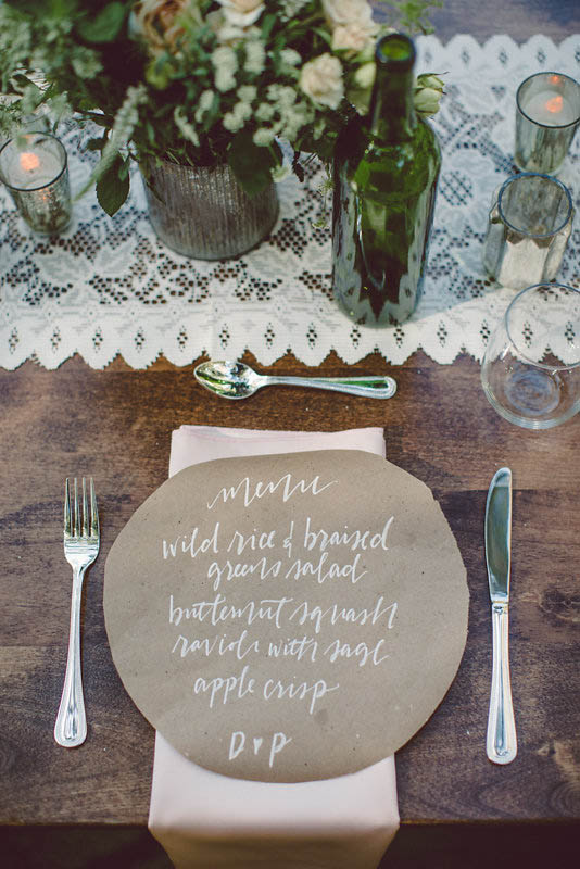 Le bellissime calligrafie dei menù e delle decorazioni sono state fatte a mano da Jilly per Jilly Ink.