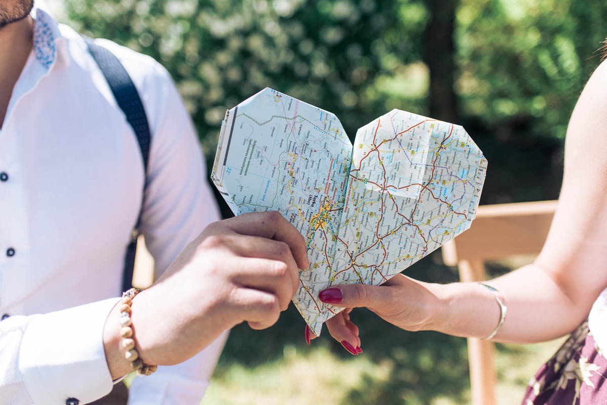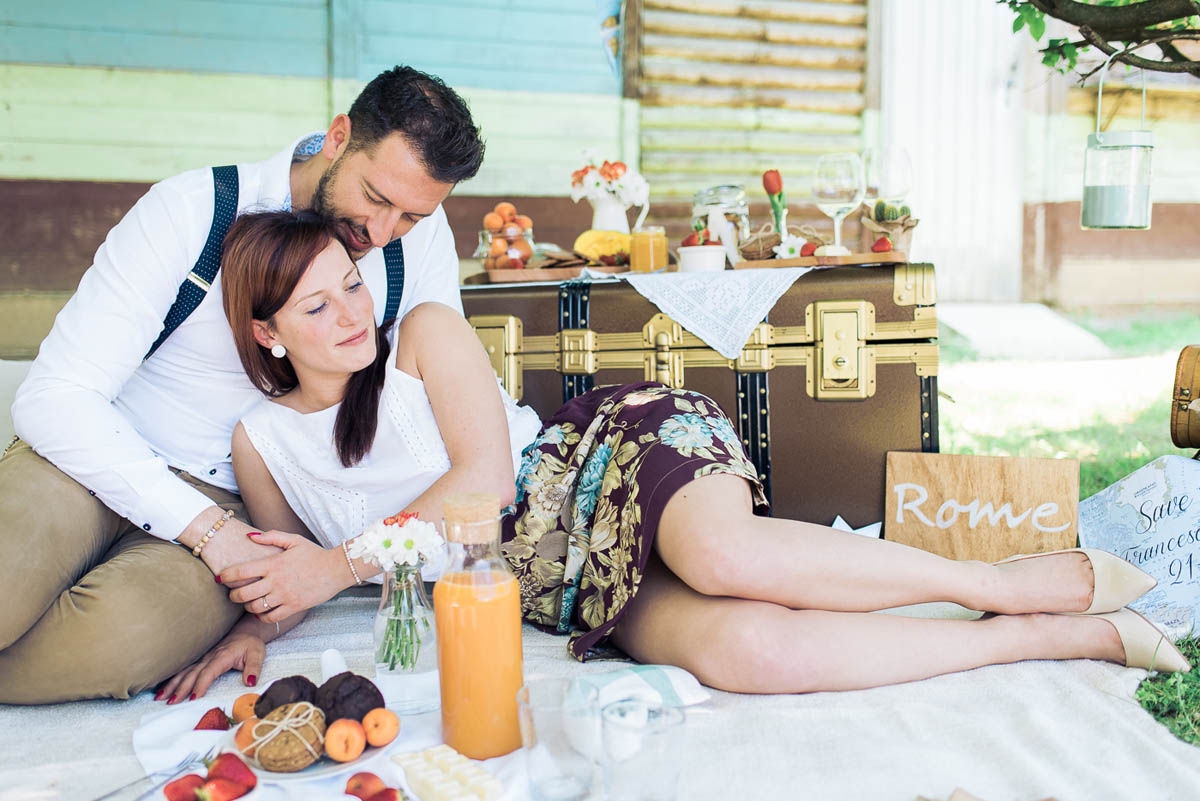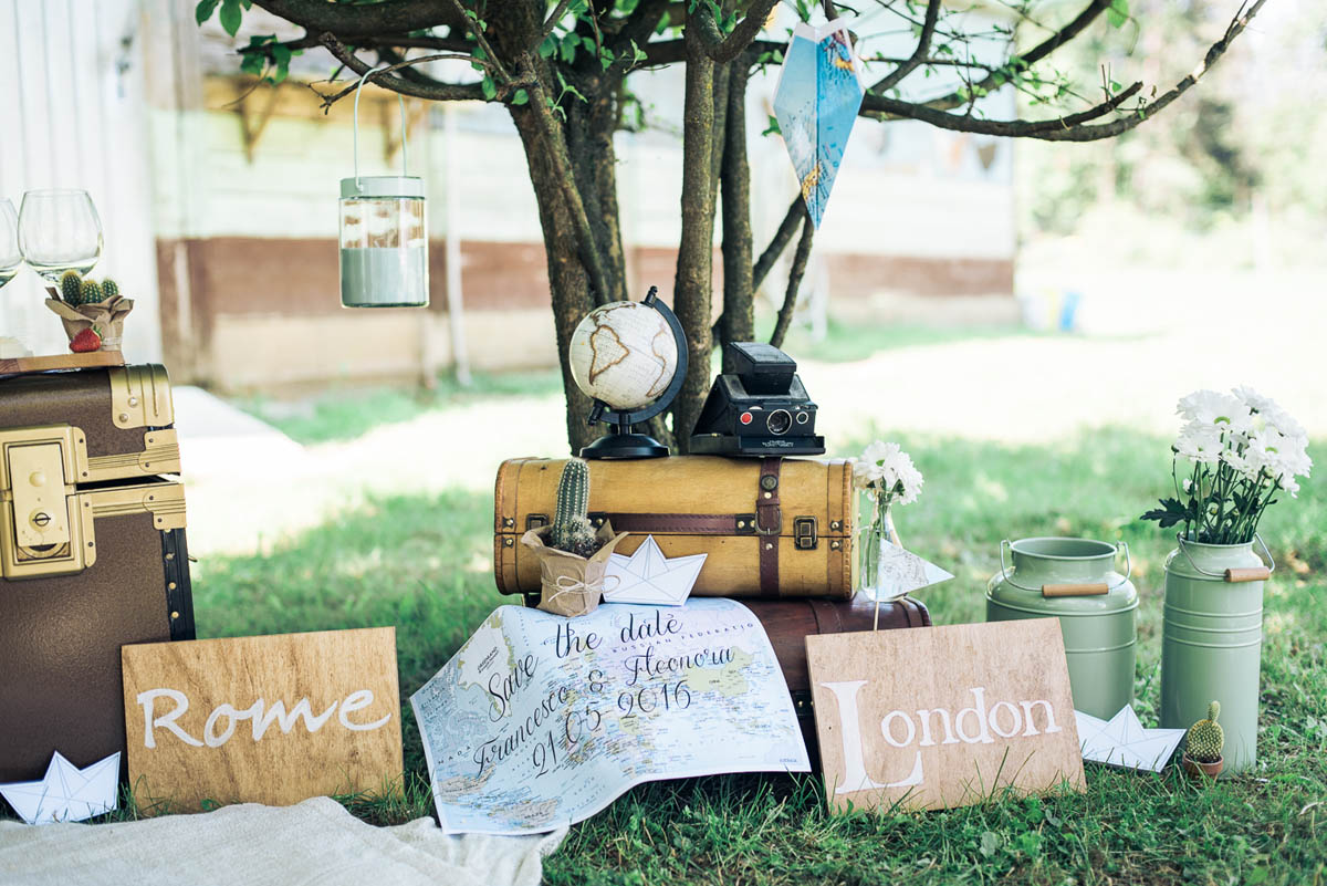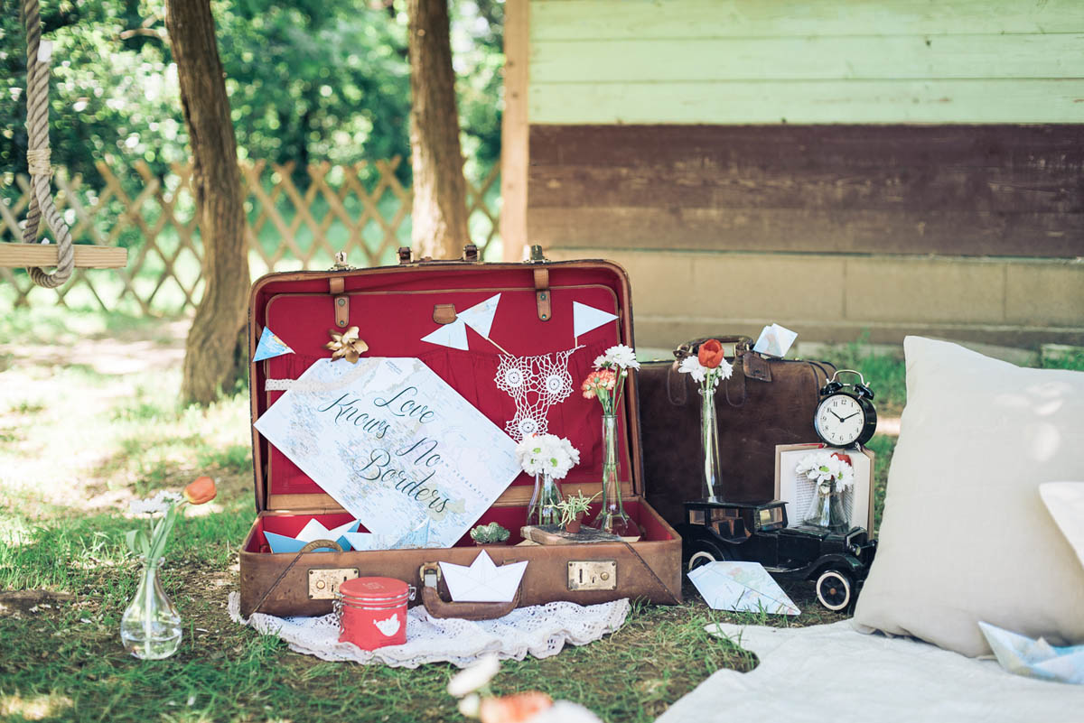 Il leitmotiv dell’intero shooting è il viaggio, rivisitato in chiave vintage. Un’antica bicicletta, il baule della nonna ed ancora vecchie valige in cuoio, targhette in legno dipinte a mano, mappamondi retrò, pizzi e merletti. Padroni indiscussi della scenografia sono dei cuori sospesi dalla forma geometrica, realizzati con delle cartine geografiche, che fanno da cornice ad un romantico picnic tra gli innamorati. Ed è proprio qui tra lettere e promesse d’amore che la loro più grande avventura ha inizio.