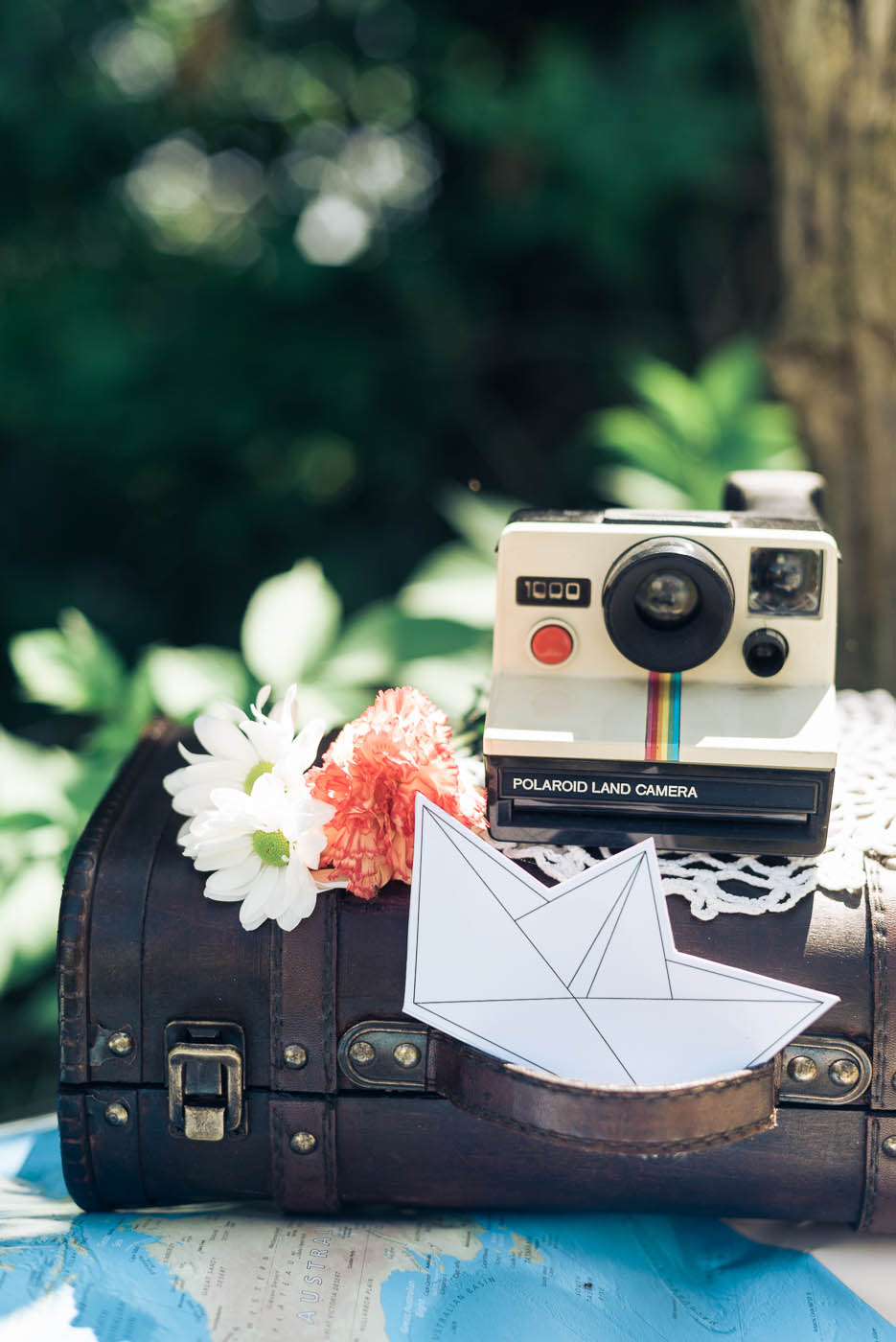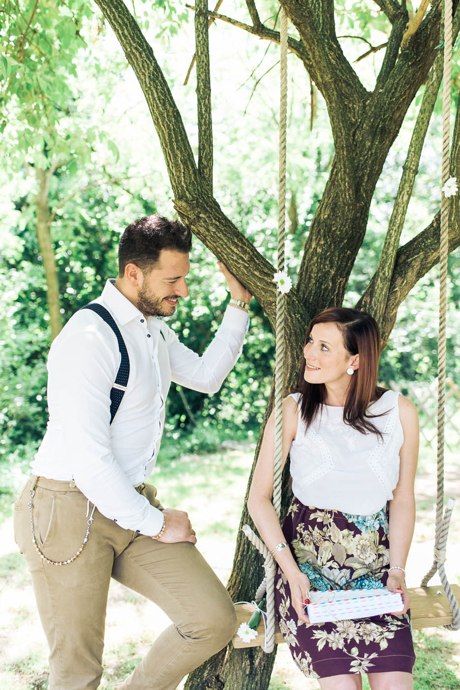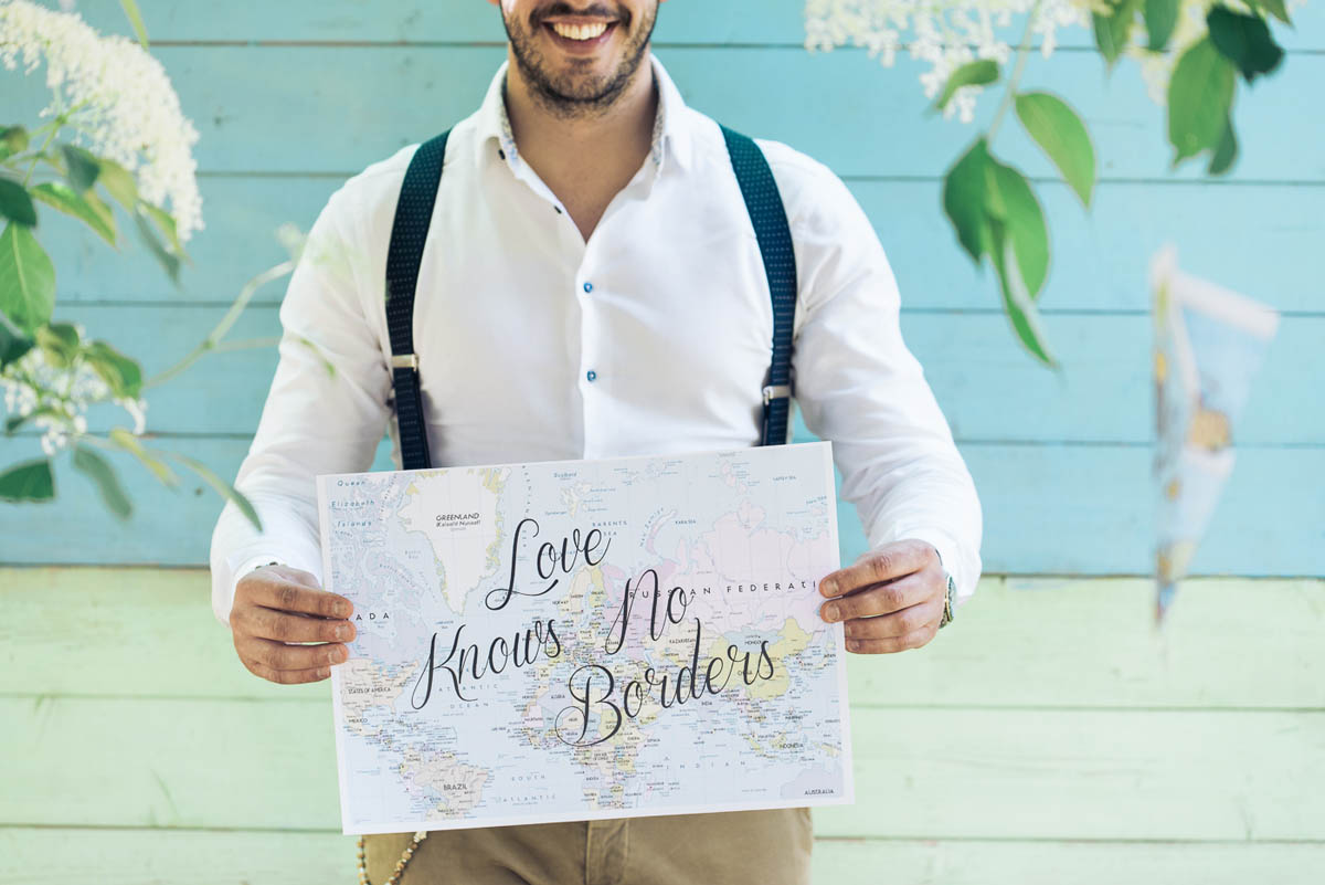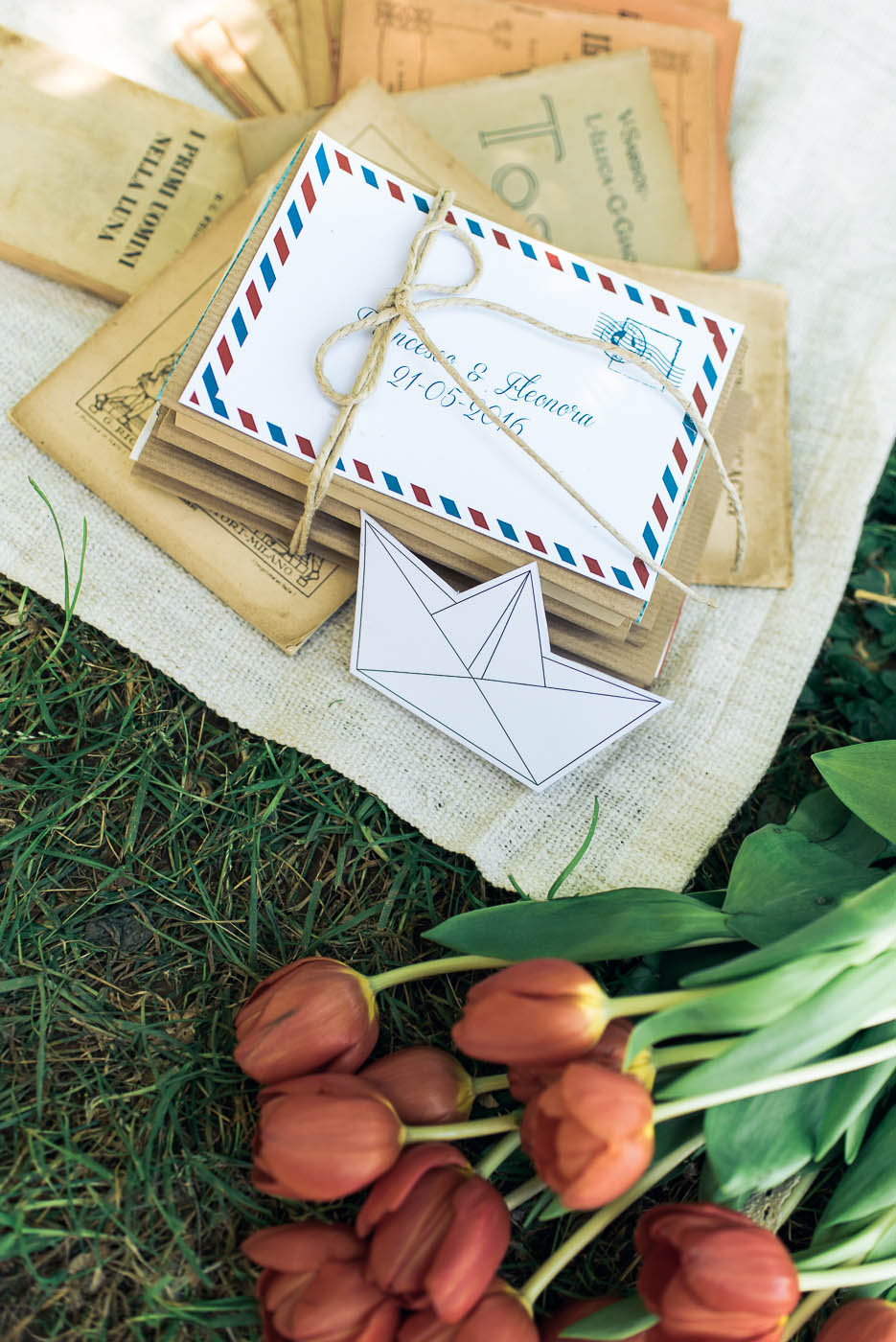 Il leitmotiv dell’intero shooting è il viaggio, rivisitato in chiave vintage. Un’antica bicicletta, il baule della nonna ed ancora vecchie valige in cuoio, targhette in legno dipinte a mano, mappamondi retrò, pizzi e merletti. Padroni indiscussi della scenografia sono dei cuori sospesi dalla forma geometrica, realizzati con delle cartine geografiche, che fanno da cornice ad un romantico picnic tra gli innamorati. Ed è proprio qui tra lettere e promesse d’amore che la loro più grande avventura ha inizio.