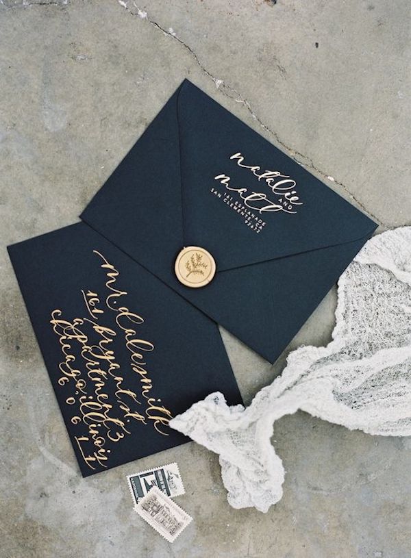 Quando penso a un matrimonio ad Halloween mi vengono in mente sempre due cose: nero e calligrafia a contrasto. Come queste buste con sigillo in ceralacca color oro.