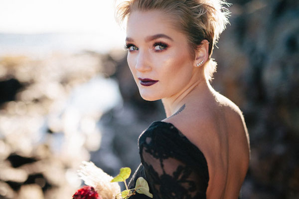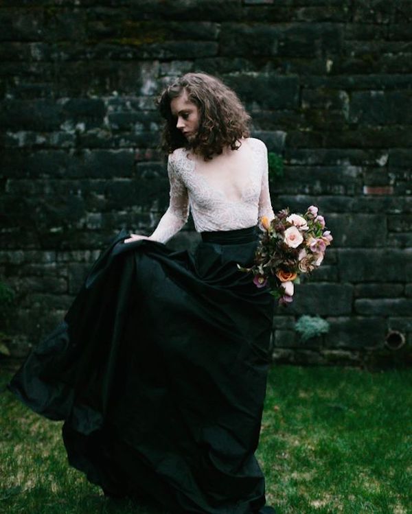 Non c’è periodo migliore per indossare un abito nero o con dettagli scuri. Adoro il corpetto in pizzo di questo modello firmato Elizabeth Mackenzie Designs.