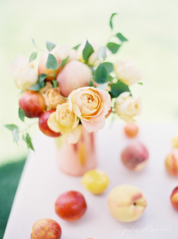 2. Adoro gli allestimenti con fiori e frutta! Questo romantico centrotavola con pesche e rose è semplicissimo e perfetto per l’estate.
