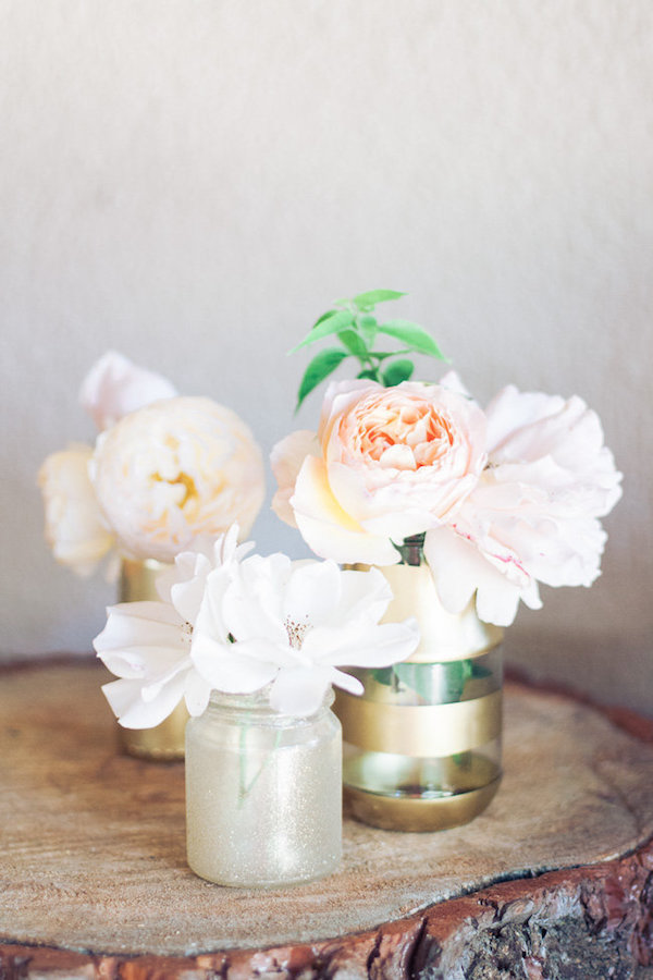 5. Create un centrotavola bello ed economico riciclando i vasetti di vetro! Vi serviranno solo vernice spray e i vostri fiori preferiti, oltre a una sezione di tronco se volete maggiore altezza.