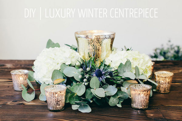 8. Questo è un progetto perfetto per un matrimonio invernale o per la tavola di Natale. L’occorrente è tutto di stagione: ortensie, eryngium, foglie di eucalipto, bacche di silver brunia e vasetti portacandele per scaldare l’atmosfera.