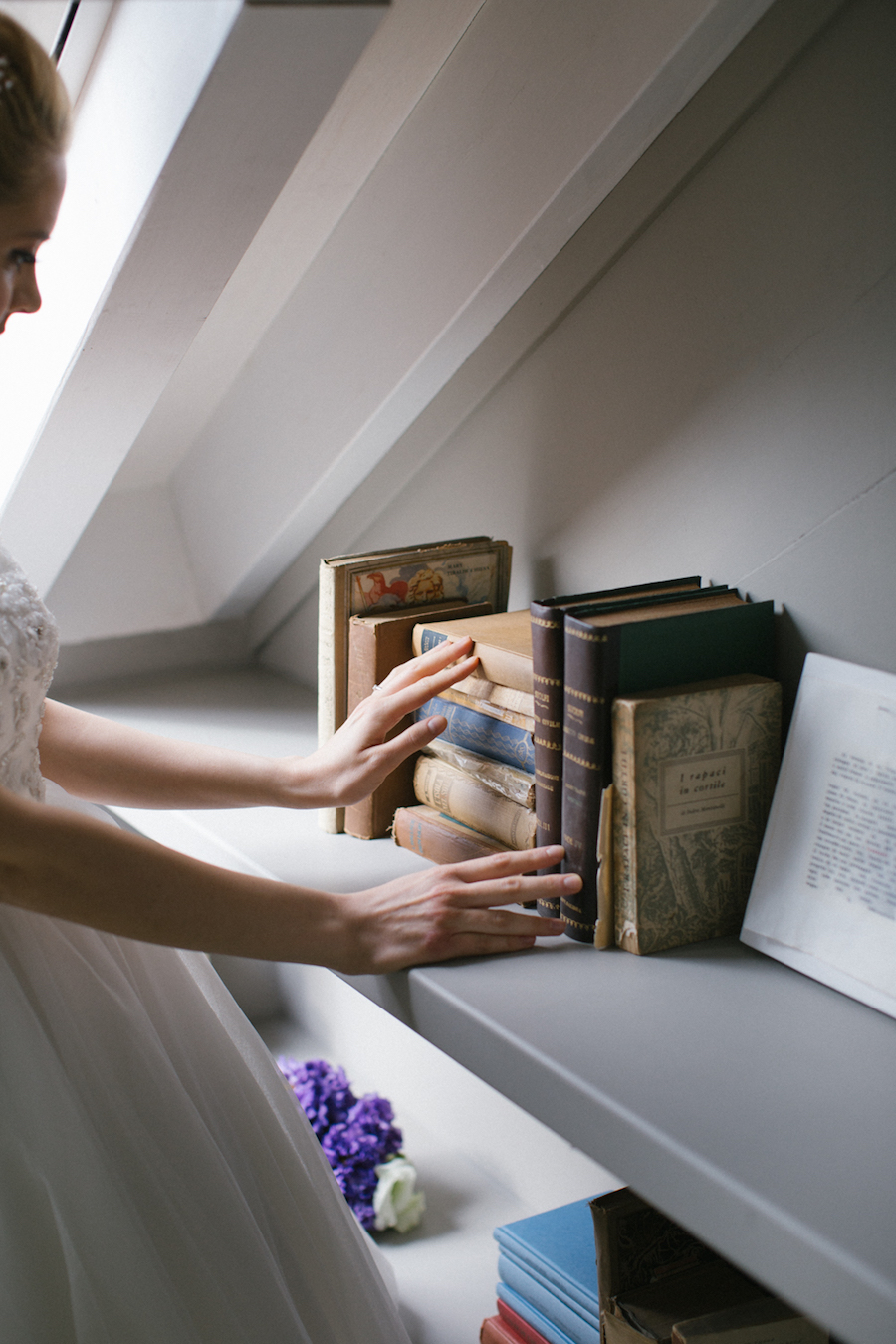 Con Valentina e Andrea di Postcard from Italy, abbiamo immaginato il percorso di una sposa che pensa al suo matrimonio, ricordando i pomeriggi passati in camera da bambina a sognare il principe azzurro e a fantasticare sul grande giorno. Il suo stile è fresco, è quello di una sposa che sa cogliere la magia che la circonda, in grado di stupirsi ancora per le piccole cose, per lei un abito corto e un bouquet raccolto di lisianthus viola, composto da Caterina Maurini Laboratorio d’arte Floreale.