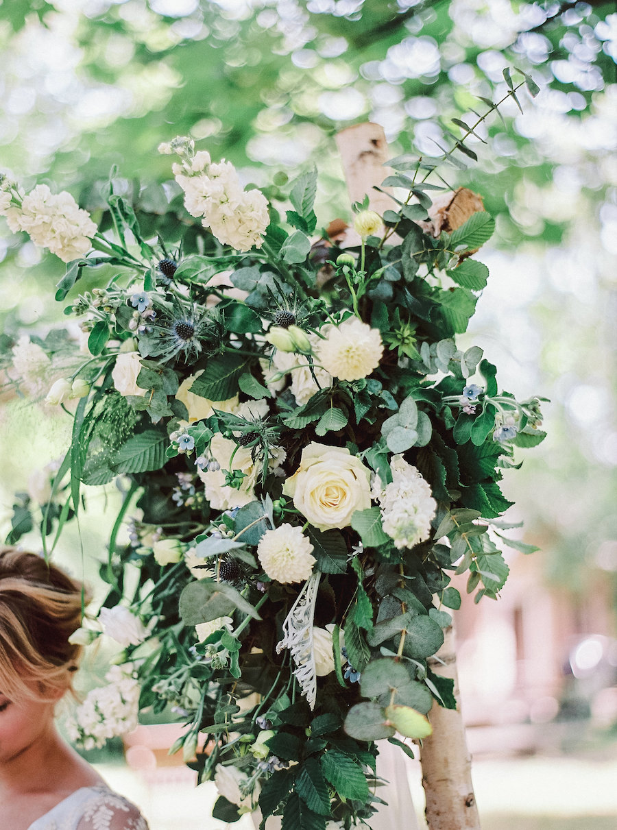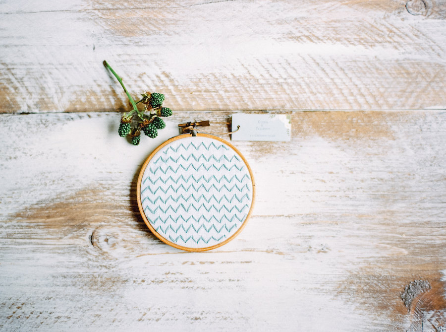 Un esempio che mi piace molto è l’acchiappasogni realizzato interamente a mano da Fabio, il nostro fiorista-decoratore, il quale ha usato dei rami storti per realizzare un acchiappasogni unico nel suo genere. Un altro dettaglio degno di nota è stato cucito e creato da Giulia di Un Peu Sauvage, una Chevron Embroidery azzurra, un’originale e perfetta bomboniera.