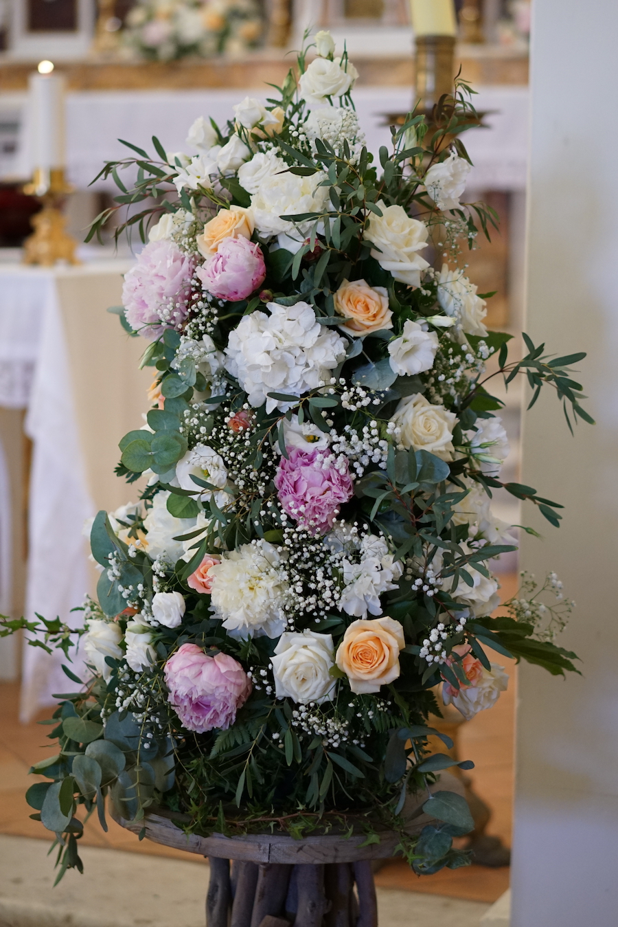 I colori scelti sono quelli tipici del Vintage Style Wedding, il pesca, due tinte di Rosa e il bianco, i fiori erano peonie, rose inglesi, ortensie e ranuncoli.